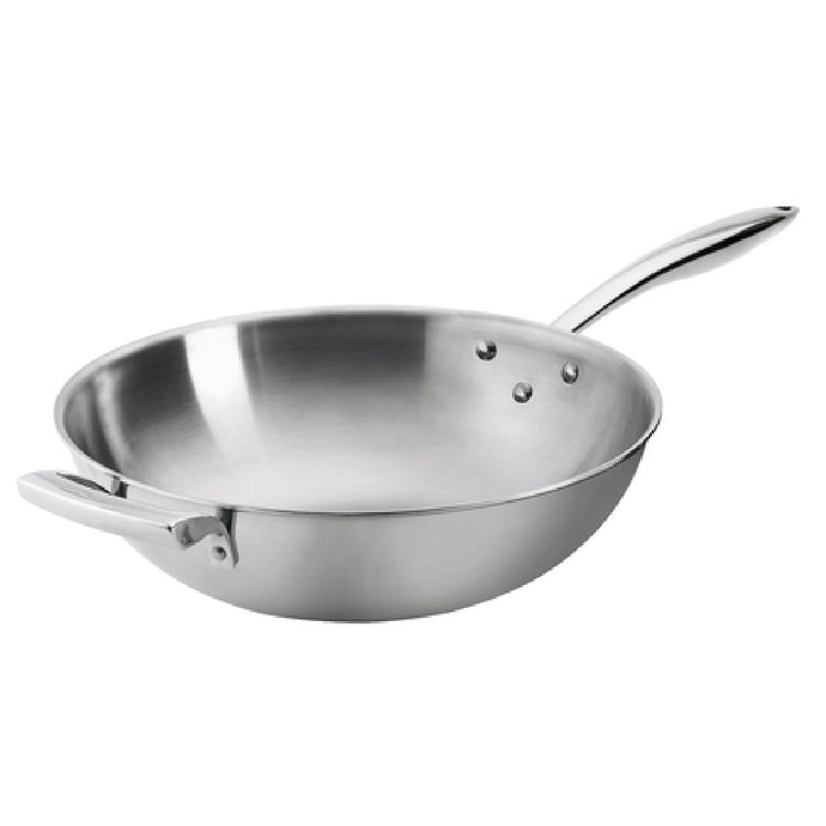 High-performance wok pans like the Browne Foodservice 5724100 are built with durable tri-ply stainless steel and aluminum cores, supporting efficient operation in busy restaurant kitchens. Designed for versatile cooktop compatibility, they are essential for medium-volume, high-intensity wok cooking, supporting fast-paced food prep workflows in professional foodservice environments.
