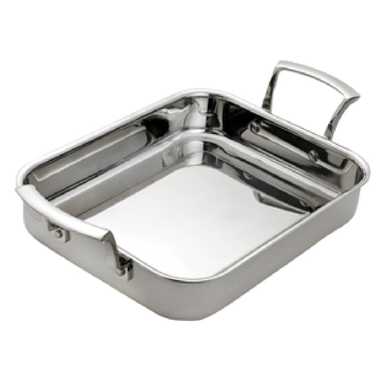 The Browne Foodservice 5724176 Thermalloy® Roast Pan is a professional-grade cookware item designed for commercial foodservice operations. This rectangular roasting pan features a 4.6-quart (4.35-liter) capacity, measuring 14" x 11-2/5" x 2", constructed from tri-ply stainless steel with an aluminum core for optimal heat conduction and durability. Its induction-ready design ensures compatibility across various cooking surfaces, including gas, electric, ceramic, halogen, and induction. The natural stainless finish enhances resistance to corrosion, while a pair of riveted ergonomic handles facilitates safe handling during busy kitchen workflows. Engineered for consistent performance, this pan provides precise heat distribution and easy cleaning, making it ideal for roasting, baking, and other food preparation tasks in high-volume commercial kitchens.