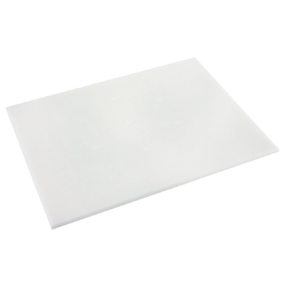 This commercial cutting board features a 12" x 18" footprint with a 1/2-inch thick polyethylene construction, providing substantial impact resistance and a lightweight design weighing approximately 3 lbs. It is engineered for frequent dishwasher cleaning, ensuring consistent sanitation. The white finish promotes cleanliness visibility and stain resistance, and its non-skid surface enhances safety during use. Operating at room temperature, this food-safe polyethylene material supports versatile food preparation tasks across various kitchen settings. The model’s dimensions are precisely 12 inches by 18 inches, facilitating easy placement within standard prep areas, while its impact-resistant properties make it suitable for heavy-duty slicing and dicing workflows.