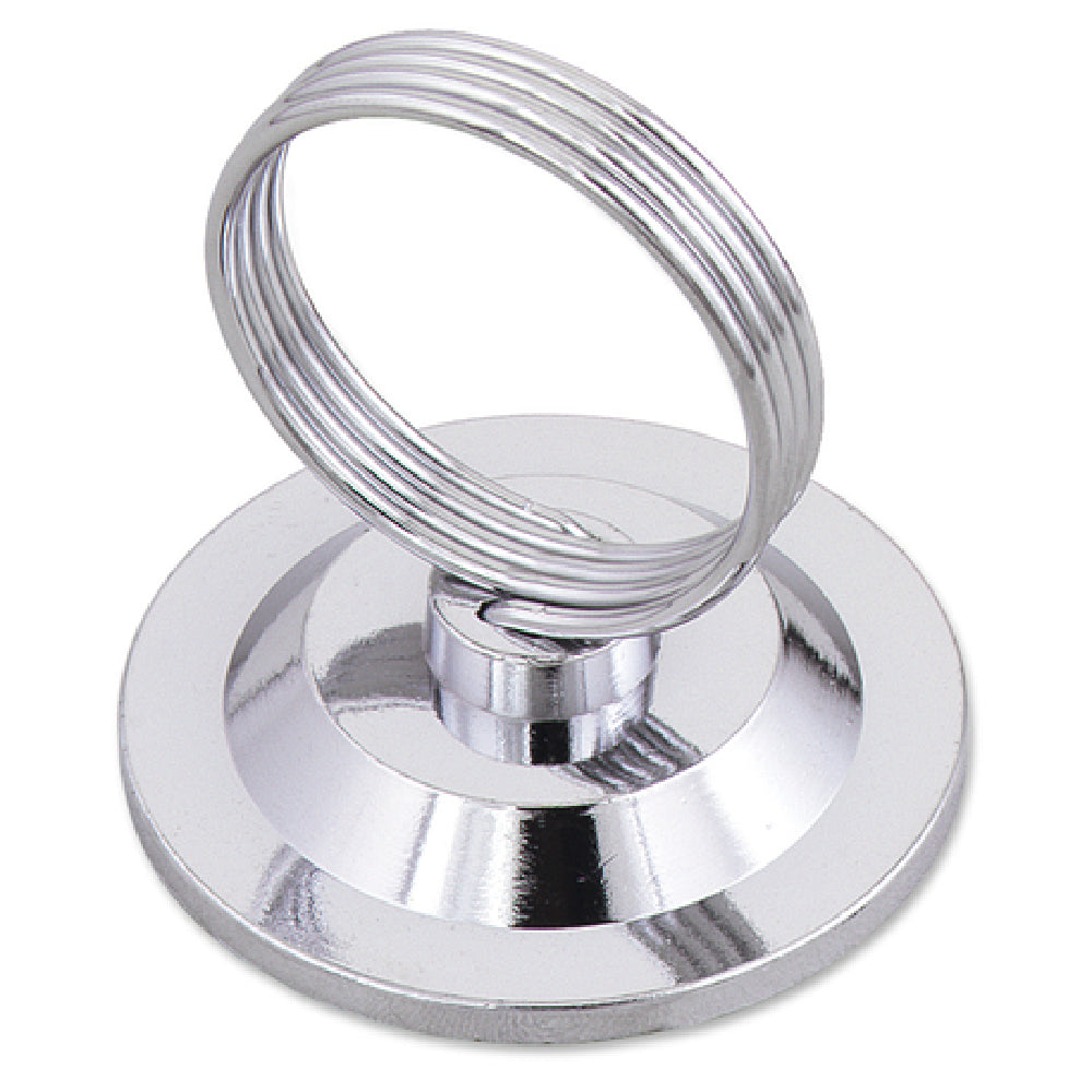 The Browne Foodservice 574107 Menu/Card Holder is constructed from metal with a nickel-plated finish, measuring 2-3/10 inches in diameter and 2-1/2 inches in height, making it suitable for displaying small signage, menus, or table numbers. Its spring wire welded to a steel base ensures a secure display with durable performance in high-traffic environments. Weighing only 0.08 lbs, this lightweight holder is designed for ease of repositioning and quick setup. The nickel coating provides corrosion resistance, supporting daily sanitation routines. Its dimensions and construction favor versatility in placement, while its robust materials ensure long-lasting functionality, capable of withstanding frequent handling and cleaning protocols.