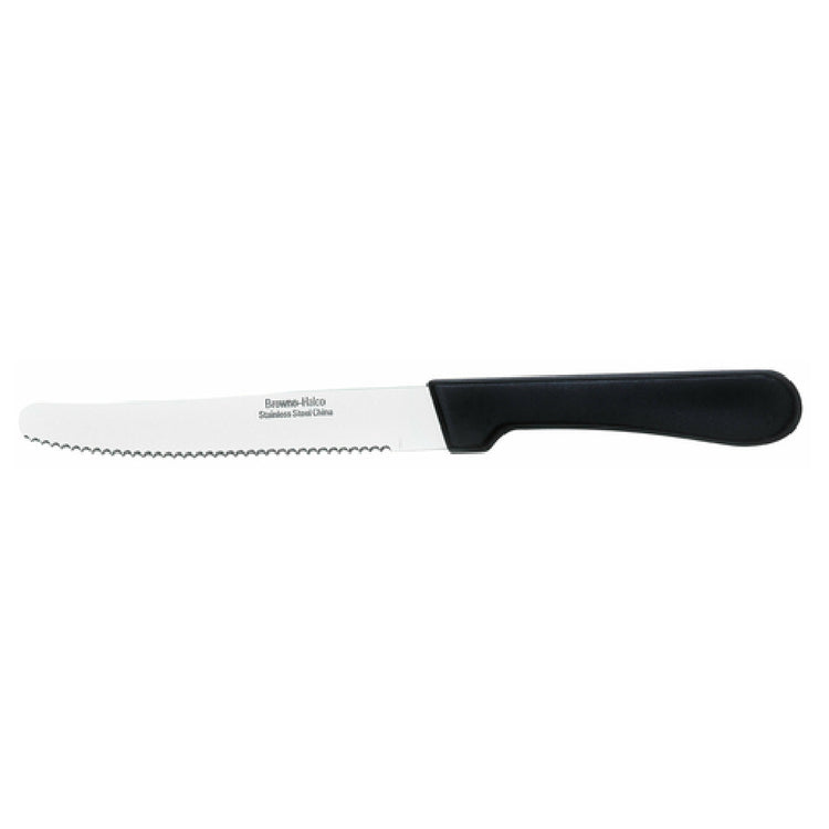 The Browne Foodservice 574329 Carnival Steak Knife is engineered with a stamped 18/0 stainless steel blade measuring 4-1/8 inches, providing corrosion resistance and edge retention aligned with professional standards. Its overall length ranges from 8 to 9 inches, featuring a polypropylene handle designed for durability and comfortable handling during continuous use. Weighing only 0.07 lbs, this lightweight tool is constructed for ease of maneuvering and swift service, compatible with standard commercial kitchen cutlery protocols. The knife’s smooth surface simplifies cleaning, with materials that withstand routine sanitation procedures essential for food safety. Dimensions are optimized for storage within standard cutlery drawers, enhancing space efficiency, while ergonomic design ensures safety with rounded tips and slip-resistant grip.