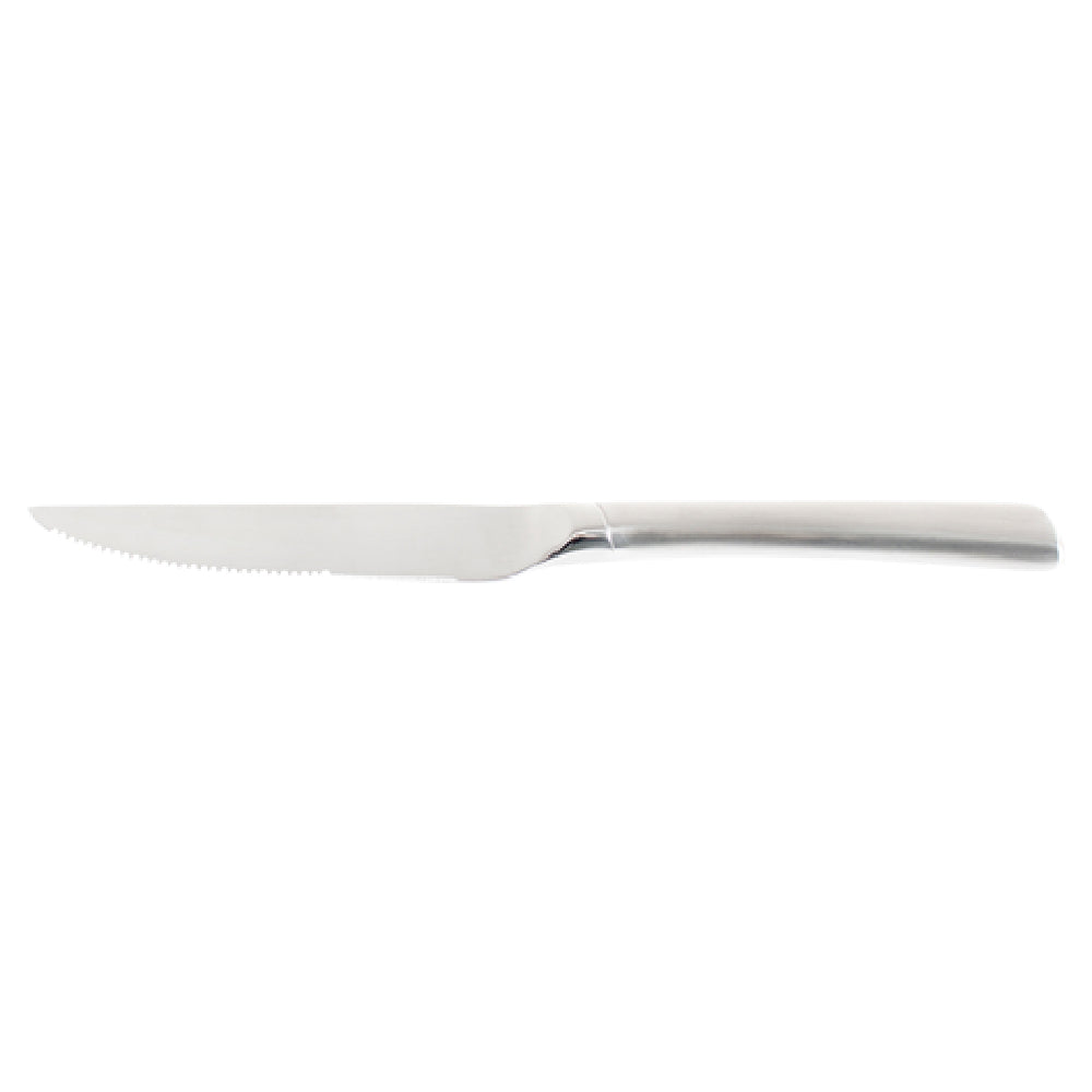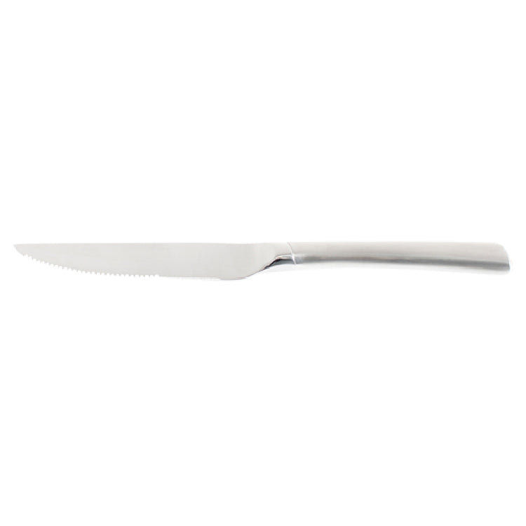 The Browne Foodservice 574344 Tournedo Steak Knife 9-1/2" Serrated is a professional-grade cutting tool designed for high-performance foodservice operations. Crafted from durable stainless steel with a satin finish, this 9-1/2" serrated steak knife features a pointed blade tip and a hollow handle for ergonomic comfort and balance. Its mirror polish bolster ensures a refined appearance, while the blade's serrated edge provides precise, effortless slicing of cooked meats and steaks in commercial kitchen settings. Ideal for restaurant kitchens, banquet facilities, and catering venues, this knife is engineered for durability, ease of maintenance, and consistent performance across demanding workflows.
