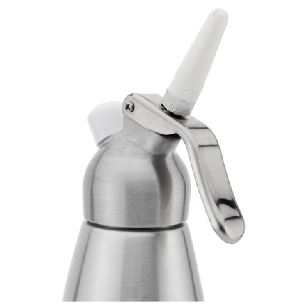 The Whipped Cream Dispenser is engineered for commercial foodservice use, offering reliable performance, easy maintenance, and efficient workflow integration. Its aluminum body ensures durability and lightweight handling, while the 0.5 qt. capacity caters to medium throughput operations. Designed for quick disassembly, it facilitates rapid cleaning and cartridge replacement, making it suitable for busy pastry stations or beverage setups requiring consistent whipped topping delivery.