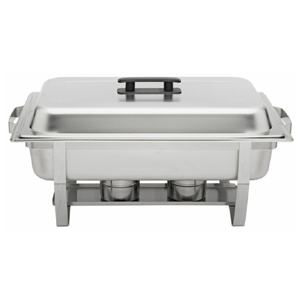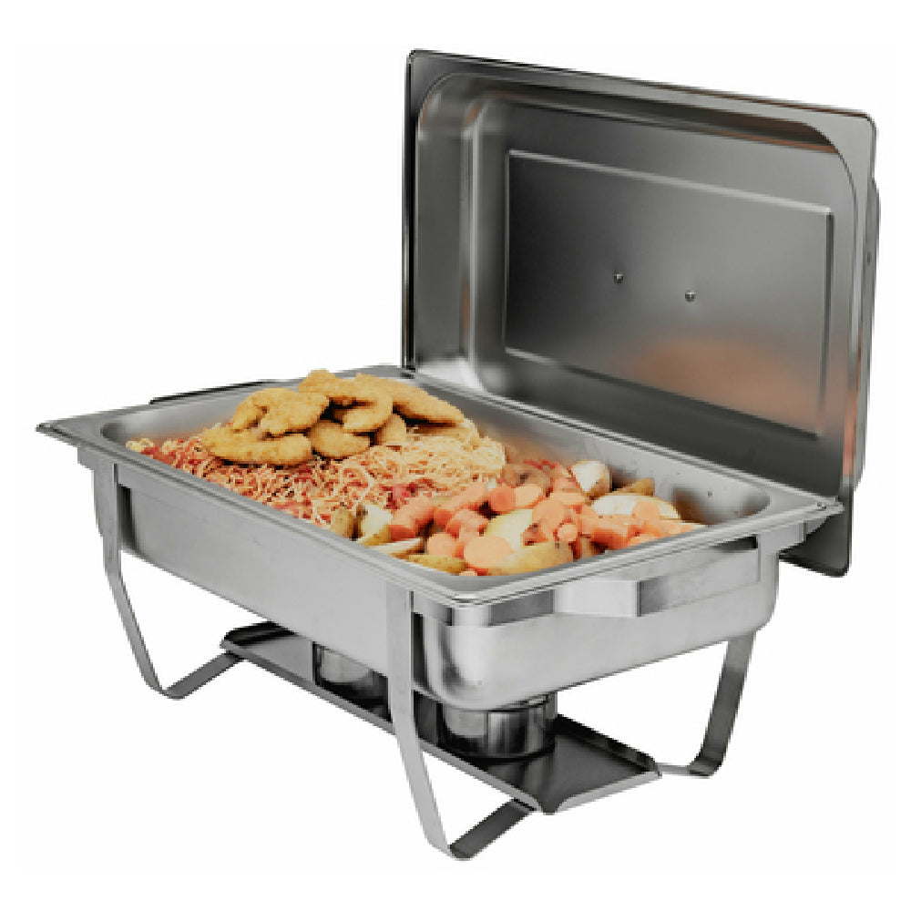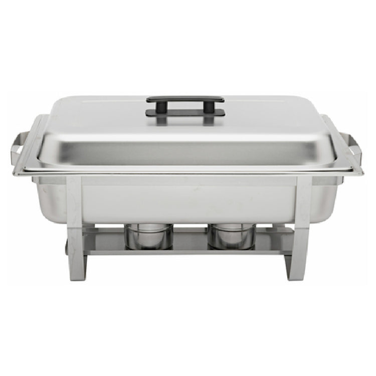 This full-size 9-quart economy chafing dish offers a welded stainless steel frame for robust durability and easy maintenance. Its rectangular design optimizes space in commercial buffets, and the included pans facilitate quick setup and efficient food presentation. Suitable for moderate workloads, it supports quick replenishment and consistent heating with canned heat source compatibility, making it ideal for catering, banquet halls, and cafeteria applications.