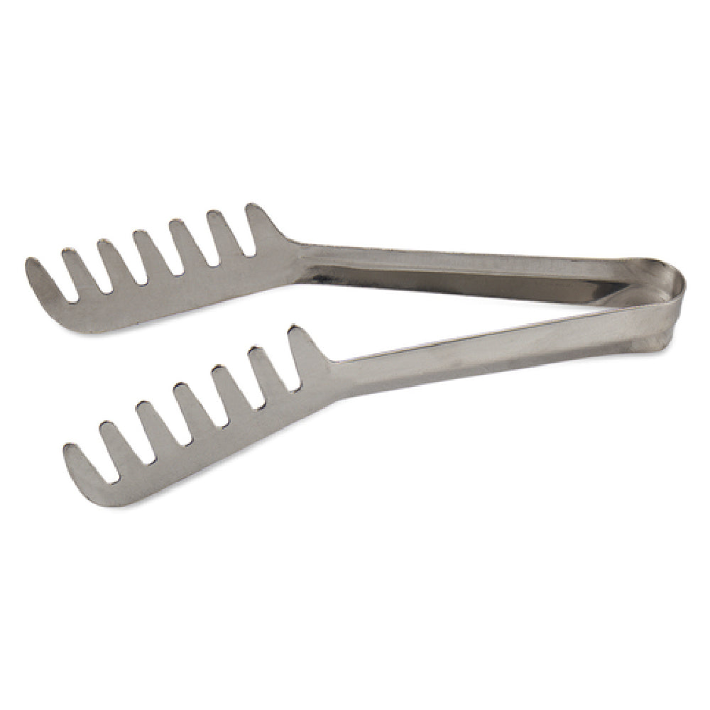 The Browne Foodservice 57533 Spaghetti Tongs are designed with a straightforward, robust framework, featuring stainless steel construction for enhanced durability and hygiene. They measure 7 inches in length, with a width of 7.5 inches, and weigh approximately 0.61 pounds. The tongs are crafted from high-strength spring steel, capable of withstanding frequent washing and sanitizing routines common in restaurant operations. The material provides excellent corrosion resistance, ensuring longevity in demanding environments. Their manual operation requires no power or electrical setup, making them versatile for various food prep and presentation stations. Their size and shape facilitate ergonomic handling, allowing for precise food control without damaging delicate items. An ideal addition to any commercial foodservice operation handling pasta, salads, or garnishing materials, these tongs upgrade workflow efficiency and sanitation standards.
