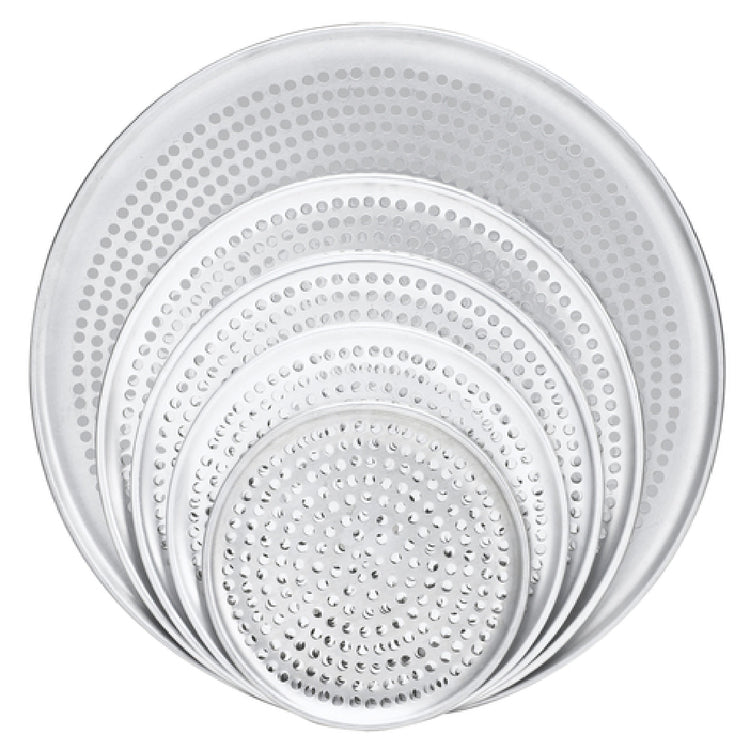 This perforated aluminum pizza plate offers durable construction for commercial environments, facilitating even heat transfer and quick airflow. Its 15-inch size is ideal for medium-volume operations, supporting high throughput without sacrificing quality. The perforated design improves crust crispness, while its lightweight yet sturdy aluminum alloy enhances ease of handling and cleaning, making it suitable for repeated daily use in pizzerias, cafeterias, and catering kitchens.