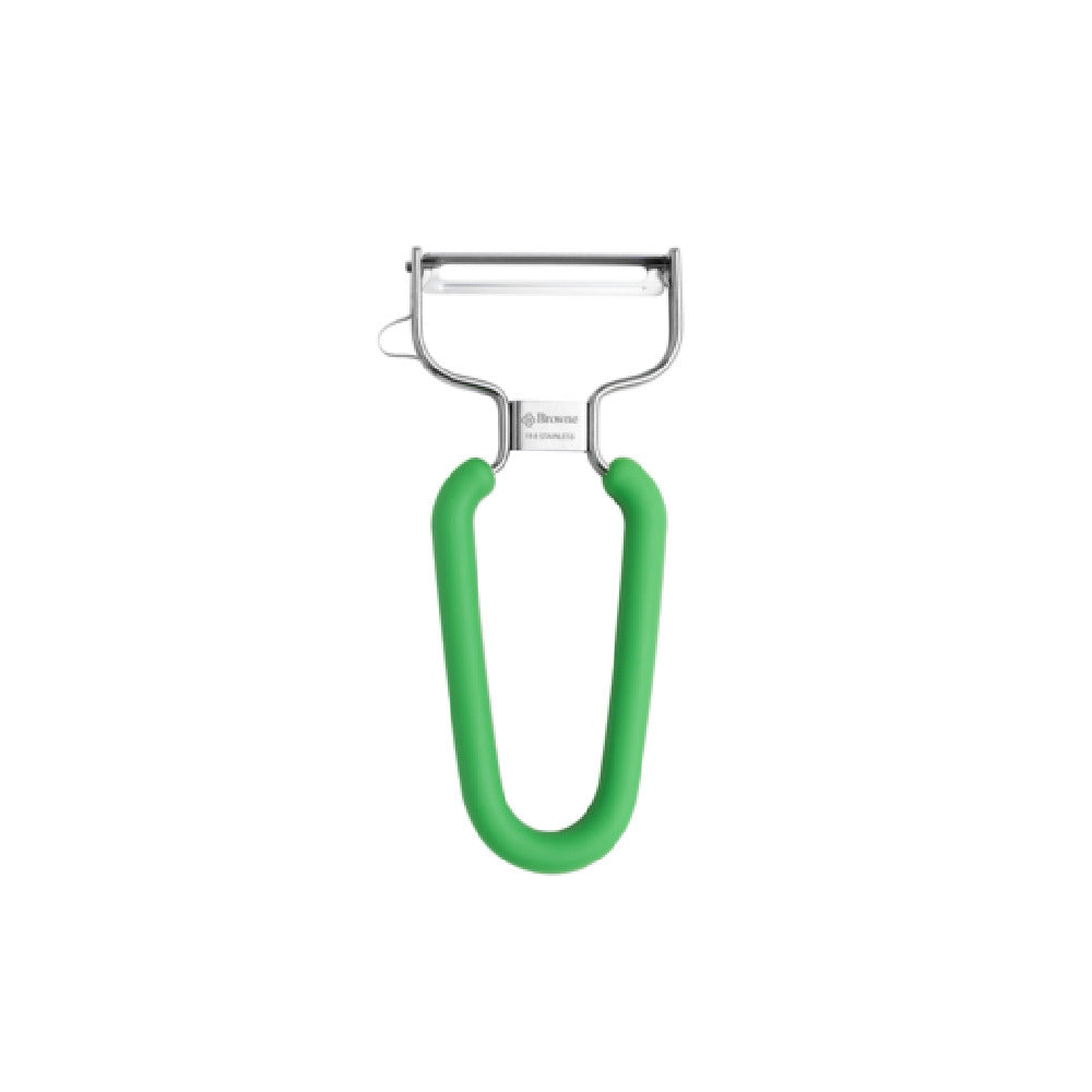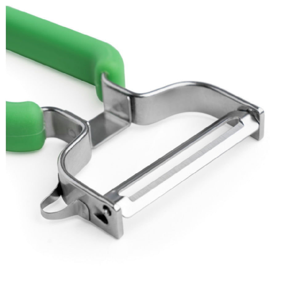 The Browne Foodservice 575430 Y Peeler Single Scalpel Blade With Blade Protector Integrated Side Cutter is a professional-grade manual vegetable peeler designed for commercial kitchens. Built with a Japanese stainless steel blade featuring a smooth edge, this tool provides precise, clean peeling performance. Its integrated side cutter enhances efficiency in food prep workflows, while the soft TPE coated handle ensures durability and ergonomic comfort. This peeler, suitable for high-volume food preparation, is often used in institutional kitchens and catering operations to optimize peeling tasks with consistent results, especially where safety and reliability are paramount.