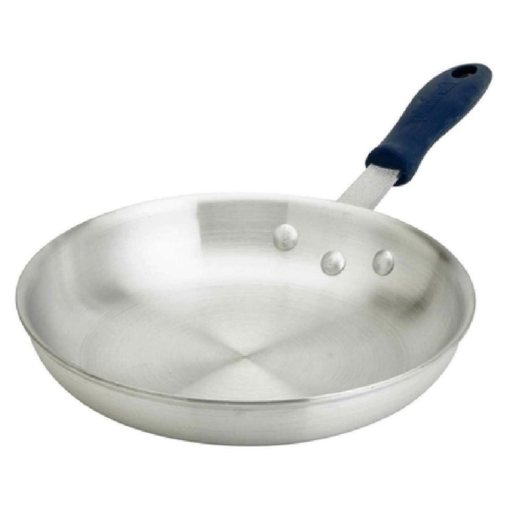 The Browne Foodservice 5814814 Thermalloy® Fry Pan offers precise heat transfer, ergonomic design, and durable aluminum construction suited for high-demand foodservice environments. The off-set riveted handle ensures stability, while the removable blue silicone heat sleeve withstands temperatures up to 572°F for safety and comfort during handling. Its compatibility with multiple heat sources simplifies integration into existing kitchen workflows, supporting consistent cooking results for medium-volume tasks, such as sautéing or browning in commercial kitchens.