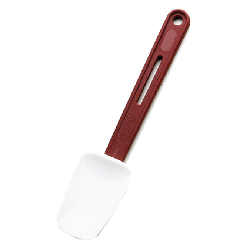 The Browne Foodservice 71782 spoonula features a silicone blade capable of withstanding temperatures up to 500°F (260°C), making it suitable for high-heat cooking environments. Its overall length ranges from 9" to 11", providing versatility for various kitchen tasks, while its lightweight construction at 0.14 lbs ensures maneuverability. Constructed from durable silicone and polypropylene, the utensil resists warping and allows for straightforward cleaning, compatible with standard commercial kitchen sanitation routines. Designed with a red handle for visibility, this food-safe kitchen tool is built to endure frequent dishwasher cleaning and high-temperature conditions. It is an essential component of commercial kitchen equipment for preparing and serving hot foods efficiently.