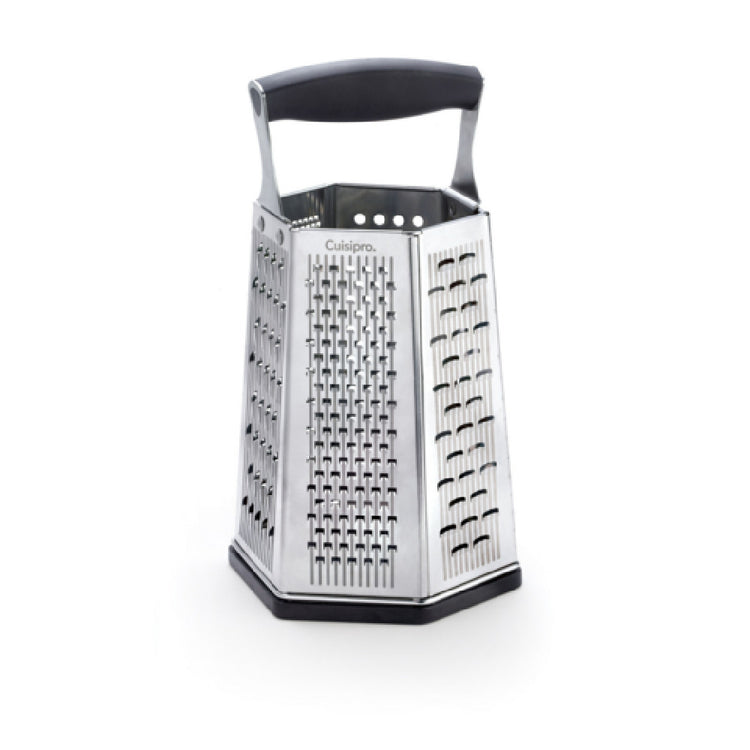 The Browne Foodservice 746877 CUISIPRO Grater 6 Sided with Surface Glide Technology is a professional-grade food tool designed for commercial kitchens. Crafted from durable stainless steel and plastic, this box grater features six distinct grating surfaces that optimize efficiency and consistency in food prep. Measuring 5.6 inches in length, 4.75 inches in width, and 9.5 inches in height, it is engineered to streamline repetitive grating tasks such as cheese, vegetables, and spices, while its surface glide technology enables more with less effort. The ergonomic handle with a non-slip finish enhances safety during extended use, and the rust-resistant construction ensures longevity in busy foodservice environments. This unit includes a cover that doubles as a scraper for removing grated material from blades, and it is dishwasher safe for easy cleaning and sanitation between uses.