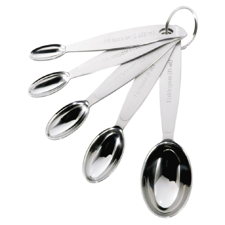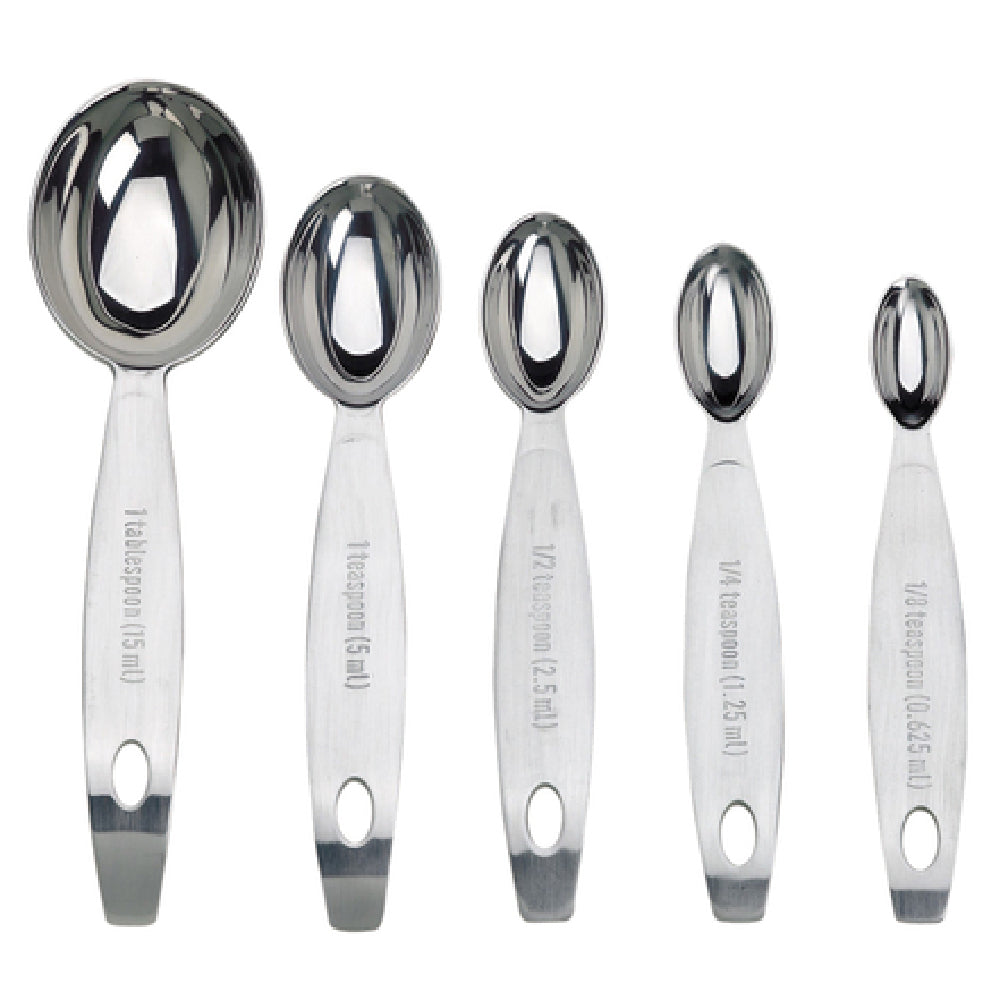 The Browne Foodservice 747002 Cuisipro Measuring Spoon Set is a professional-grade kitchen utensil designed for precise measurement in commercial foodservice environments. This stainless steel set features five nesting spoons with capacities of 1/8 teaspoon, 1/4 teaspoon, 1/2 teaspoon, 1 teaspoon, and 1 tablespoon. Its oval bowl design and curved handle facilitate accurate, ergonomic use, suitable for recipe formulation, ingredient portioning, and culinary prep. The durable, corrosion-resistant construction ensures longevity in high-volume settings, making it an ideal choice for professional kitchens requiring consistent measurement tools with easy handling and sanitation capabilities.