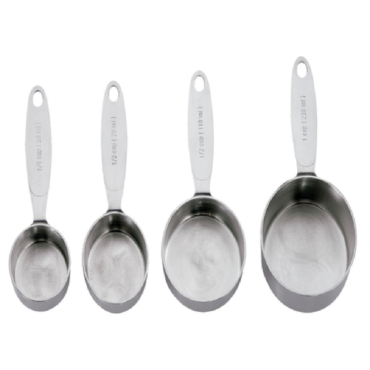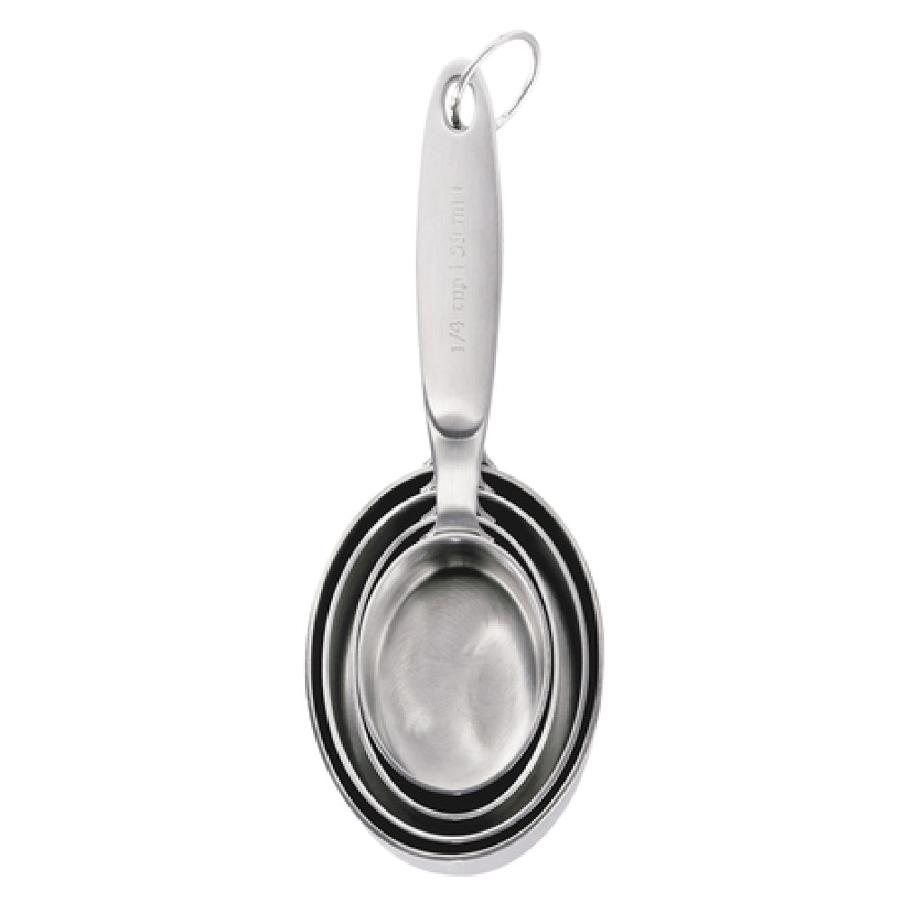 This Cuisipro Measuring Cup Set offers durable stainless steel construction with an oval bowl design optimized for ease of handling and ingredient scooping. Each cup features engraved measurement markings resistant to wear, facilitating quick identification during busy kitchen workflows. Suitable for manual use in high-traffic food prep environments, the nesting feature maximizes storage efficiency, while the stainless steel material ensures longevity and easy cleaning. Perfect for restaurants, catering services, and institutional kitchens with frequent ingredient measurement needs.