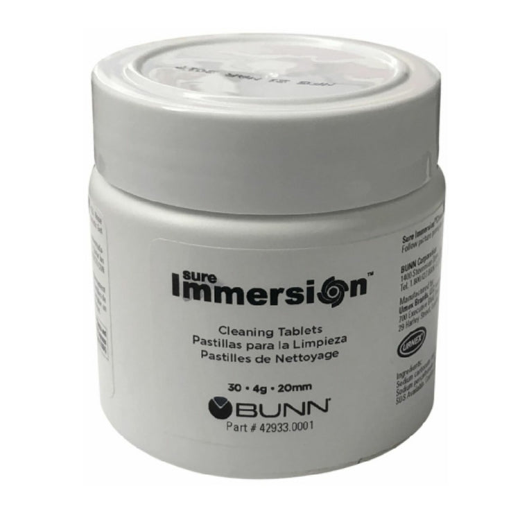The Bunn 42933.0101 Cleaning Tablets (2) Jars/pack Sure Immersion™ are professional-grade cleaning accessories designed for commercial coffee equipment maintenance. These specialized cleaning tablets serve to effectively remove coffee oil residues, mineral deposits, and other build-up from brewing machines and related components. Crafted by Bunn, a recognized manufacturer in the foodservice equipment industry, this product is optimized for high-volume operations requiring consistent sanitation. The formulation ensures compatibility with various beverage equipment, providing a vital solution for maintaining optimal machine performance and beverage flavor integrity. Each jar contains an exact measure of cleaning tablets, facilitating precise dosing, with the product weighing 0.75 lbs per jar. This accessory supports efficient workflow, reducing downtime and simplifying routine cleaning cycles—an essential tool for commercial kitchens and coffee service environments aiming for hygienic precision and operational efficiency.