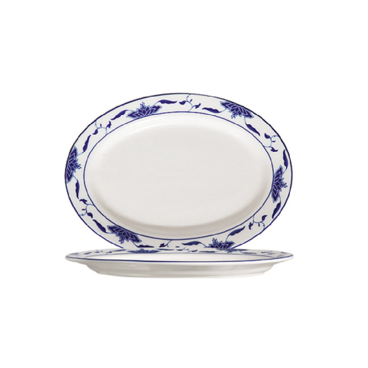 CAC China, 103-12, Blue Lotus Platter, 10-1/4"L x 7-3/8"W x 1"H, oval, rolled edge, dishwasher, oven and microwave safe, porcelain, Blue/Bone White (Sold by case) (Packed By: 2 Dozen Per Case)