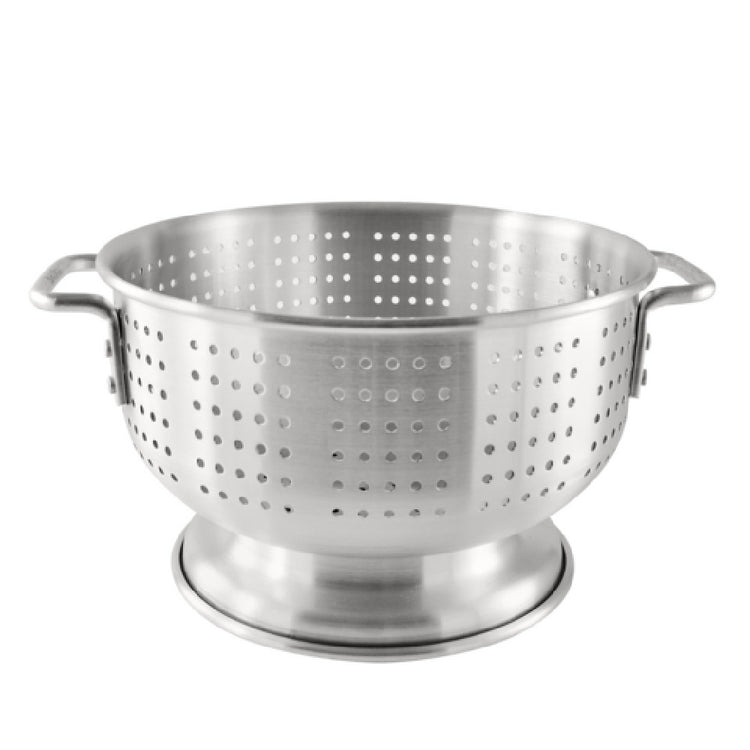 This colander's technical design prioritizes durability, ease of handling, and suitable integration into busy kitchens. Made from high-quality aluminum, it withstands frequent thermal exposure and vigorous cleaning routines common in commercial establishments. The 8-quart capacity is ideal for high-output food prep, while flat handles simplify maneuvering and stability during draining. Its footed structure provides stability on work surfaces, supporting workflow efficiency in professional kitchens with moderate throughput. The rounded shape enables uniform strain relief on cookware, making it highly effective for large-scale food processing.