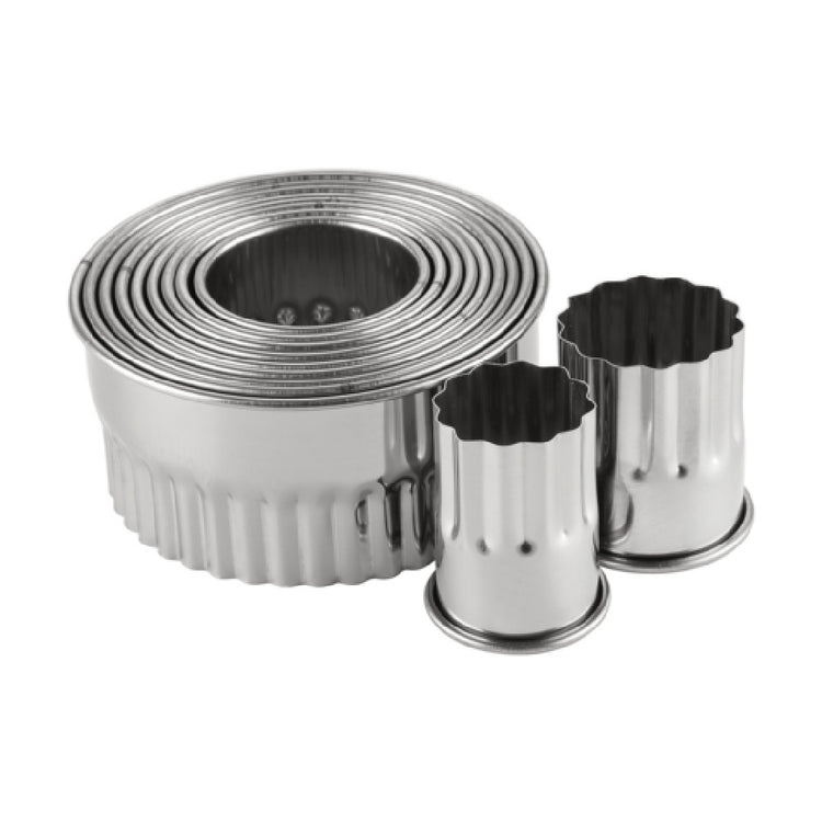 The CAC China B10CT-11F Cookie/Pastry Cutter Set is a professional-grade dough and cookie cutter collection designed for commercial foodservice environments. It comprises 11 precision-crafted, round cutters with a fluted edge, each measuring 2 inches in height. Constructed from durable stainless steel, these cutters ensure consistent, clean cuts in bakery production lines, patisserie work, and high-volume pastry departments. Optimized for efficiency, the set streamlines dough shaping processes and enhances product presentation with its standardized dimensions and quality materials.
