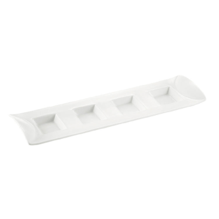 This compartment tray offers precise 1/2 oz. capacity per section, optimized for high-volume presentation and portioning. Crafted from durable porcelain with a Super White finish for enhanced appearance and easy cleaning, it is dishwasher, microwave, and oven safe, ensuring seamless integration into busy commercial workflows. Its rectangular, four-compartment design improves efficiency in food plating, serving, and portion control, suitable for various foodservice applications, including catering, fine dining, and institutional kitchens.