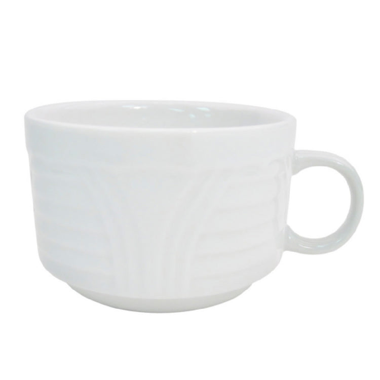 A commercial coffee cup is a durable, food-safe porcelain or ceramic vessel designed for high-volume beverage service in restaurants, cafés, and catering. The CAC China CRO-1-S Corona Coffee Cup, with its 8 oz. capacity, stackable embossed design, and microwave and dishwasher safety, is ideal for consistent presentation and efficient workflow in busy foodservice settings. Used primarily in cafes and hospitality environments, it meets the demands of frequent use while maintaining aesthetic appeal and operational reliability.