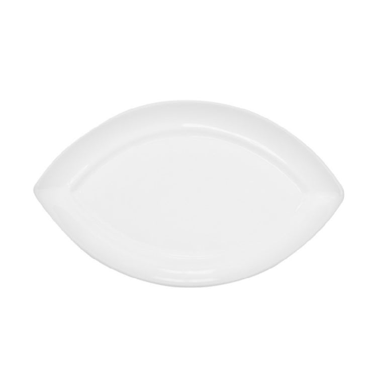 The CAC China RCN-SW12 platter's unique eye-shaped design and robust porcelain construction set it apart from standard serveware, providing both aesthetic appeal and durability for busy foodservice environments. Its oven, microwave, and dishwasher safe features streamline kitchen operations, reducing handling time and improving sanitation. Its compact size and high-quality finish make it ideal for sophisticated presentations and high-productivity workflows in upscale restaurants and catering services.