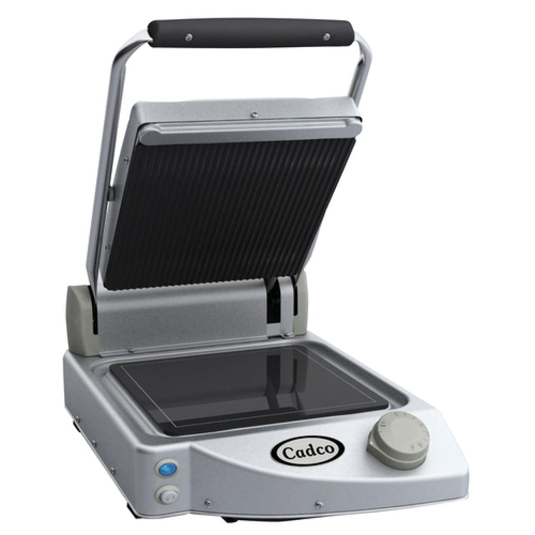 The Cadco CPG-10 Single Panini Grill with black glass-ceramic surfaces is a commercial-grade sandwich and panini grill engineered for high-performance foodservice applications. Featuring a ribbed top plate and a smooth bottom plate, this unit provides precise heat distribution over a 9-7/8" x 9-7/8" grilling area, suitable for consistent panini and sandwich preparation in busy kitchens. Its adjustable thermostat reaches up to 740°F, enabling optimal cooking control. Constructed with durable stainless steel housing and non-slip feet, the CPG-10 delivers reliable operation while integrating seamlessly into professional culinary workflows. Its features support high-volume throughput, ensuring efficient service in restaurant, catering, or food retail environments.