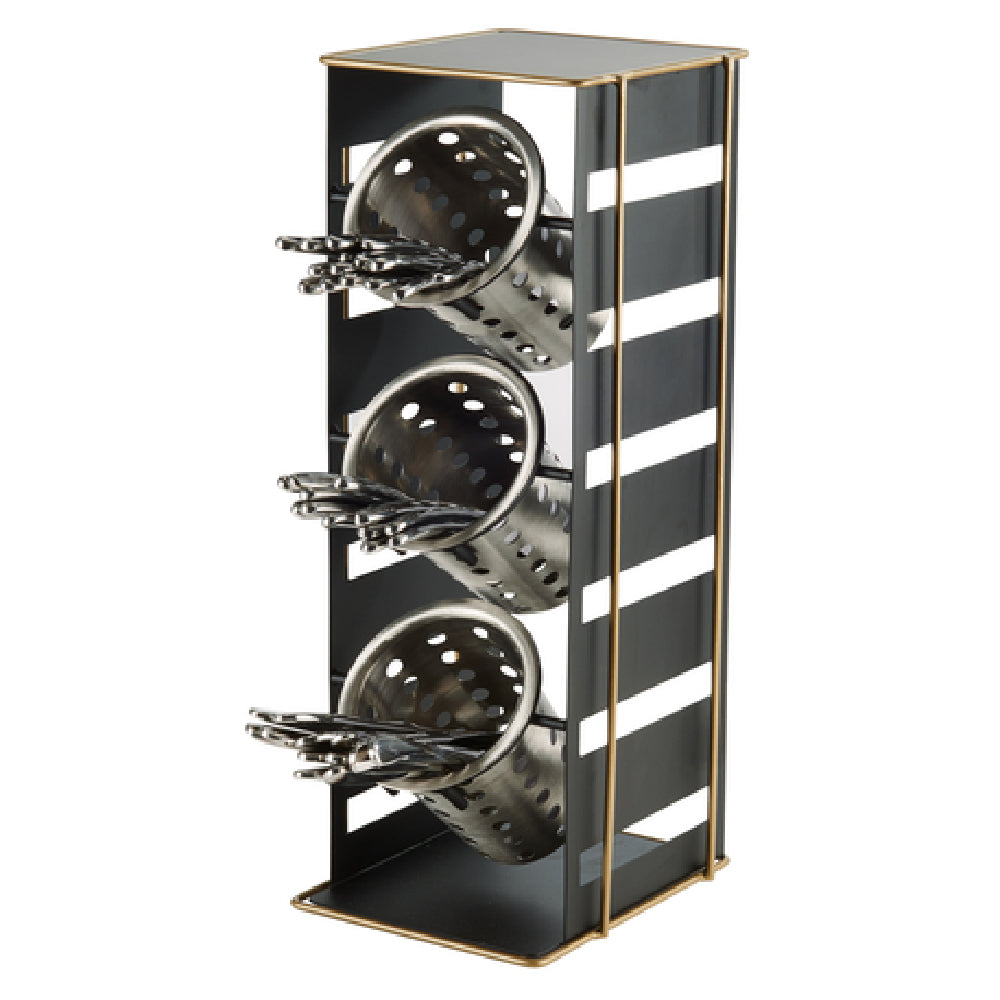 A commercial cylinder display is a sturdy, multi-tiered stand designed to hold and showcase cylinders containing condiments, utensils, or other small items in foodservice settings. Typically constructed from durable materials such as sheet metal and steel, it supports organized, accessible presentation for beverage or condiment stations. The Cal Mil 22086-90 Empire Cylinder Display is installed in countertop or tabletop arrangements, supporting efficient workflows and enhancing product presentation. It is especially suitable for hospitality venues, catering, and self-serve environments that require reliable, easy-to-clean displays for high-volume use.