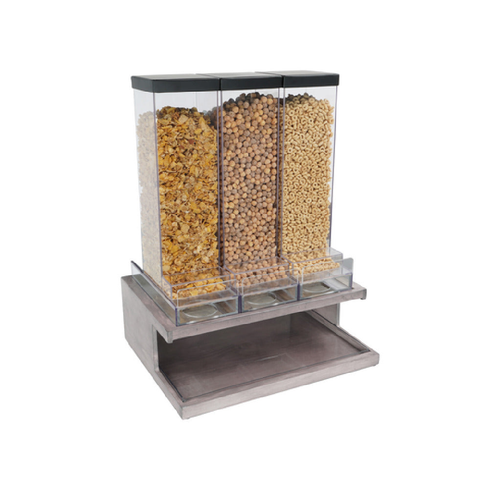 The Aspen Cereal Dispenser offers reliable performance with individual, easily accessible sections suitable for high-traffic foodservice settings. Crafted from resilient materials, it ensures longevity in demanding environments. Its user-friendly lever mechanism simplifies portion control and cleaning routines, promoting sanitation and efficiency. Intended for countertop placement, it fits seamlessly into commercial breakfast stations, bakery counters, and buffet setups, supporting smooth product flow. The unit's robust construction and precise design contribute to consistent dispensing and minimal maintenance, optimizing operational workflows.