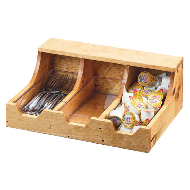 This condiment organizer is designed for high-capacity condiment and garnish storage in commercial foodservice settings, featuring three spacious compartments with transparent removable inserts for streamlined access. Crafted from durable wood with a rustic pine finish, it ensures longevity under frequent use. Its ergonomic, easy-to-maintain design supports fast refilling and cleaning routines, perfect for establishments managing diverse condiment varieties. The compact size allows seamless integration into countertops, enhancing workflow efficiency in fast-paced kitchens or catering stations.