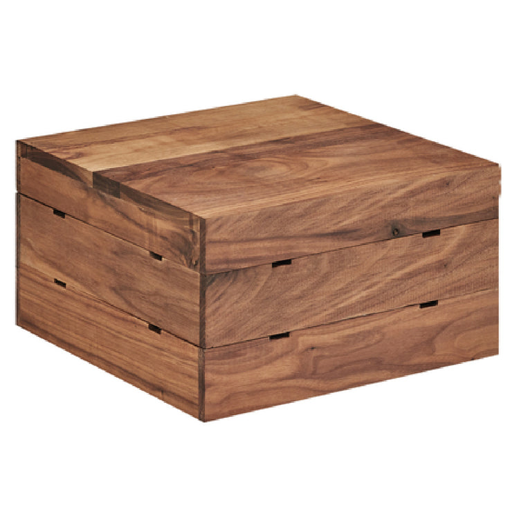 The Cal Mil 3628-7-78 Mid-Century Crate Riser is a versatile food presentation accessory designed for commercial foodservice applications. This square display riser measures 12 inches in width and depth with a height of 7 inches, crafted from durable wood finished in a natural walnut tone. Its slotted design allows for easy mounting with brackets, while the flip feature enables transformation into a functional crate, optimizing space and display flexibility in restaurant, catering, or retail settings. This unit facilitates elevated product display, enhancing visual merchandising and operational efficiency for tabletop setups and countertop arrangements, particularly in medium-volume foodservice environments.