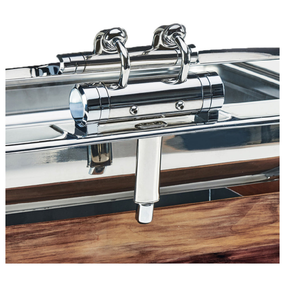 The Cal Mil 3705-49 stands out with its premium stainless steel construction, seamless hinged lid, and elegant walnut windguards, offering durability and refined aesthetics. Its compact design minimizes footprint without sacrificing capacity, supporting efficient catering and buffet operations. Enhanced ease of cleaning and reliable heat retention improve operational efficiency compared to standard models.
