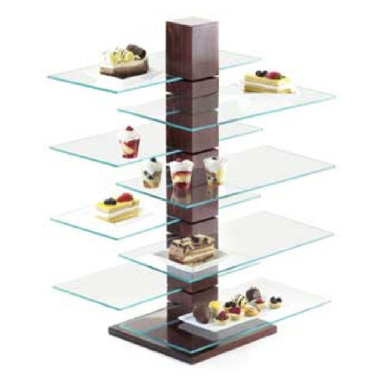 A commercial display riser is a specialized platform designed to elevate products for optimal visibility in retail and hospitality settings. The Cal Mil 791-52 Westport Pillar Riser is a precise example, featuring durable dark wood construction, notched sides for glass shelving, and a height of 32-1/2 inches, suitable for countertop use. It is installed in bakery counters, retail displays, or buffet stations, supporting mid-volume presentation needs with stability and style to enhance product presentation and operational efficiency.