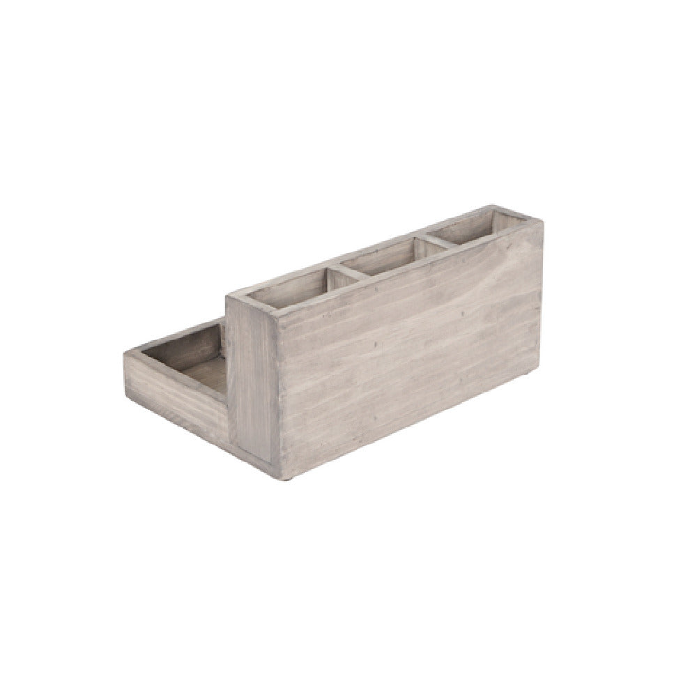 The Aspen Packet/Stir Stick Holder offers a robust, wood-based construction optimized for commercial foodservice use. Designed for countertop deployment, its 6"x9" footprint maximizes storage capacity while maintaining a sleek profile. The sturdy gray-washed pine enhances durability and aesthetic appeal, ensuring longevity even in high-traffic areas. Simple maintenance routines and a straightforward design facilitate swift cleaning, supporting sanitation standards. The compact, lightweight form factor allows for quick repositioning and integration into existing service workflows—ideal for busy cafés, buffets, and self-serve stations.