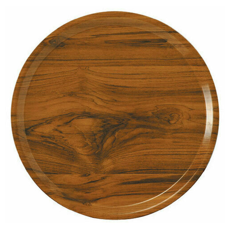Designed for commercial foodservice, this fiberglass round tray offers a 10" diameter with a country oak finish that enhances presentation. Its dishwasher-safe composition simplifies cleaning routines, reducing labor and ensuring consistent hygiene. Extremely lightweight at 0.48 lbs, it facilitates ease of handling during bustling service periods. The fiberglass material provides superior impact resistance, ideal for frequent use in institutional kitchens. Its compatibility with standard tray delivery and stacking systems streamlines workflow, supporting foodservice operations that require reliable, durable servingware for high throughput environments.