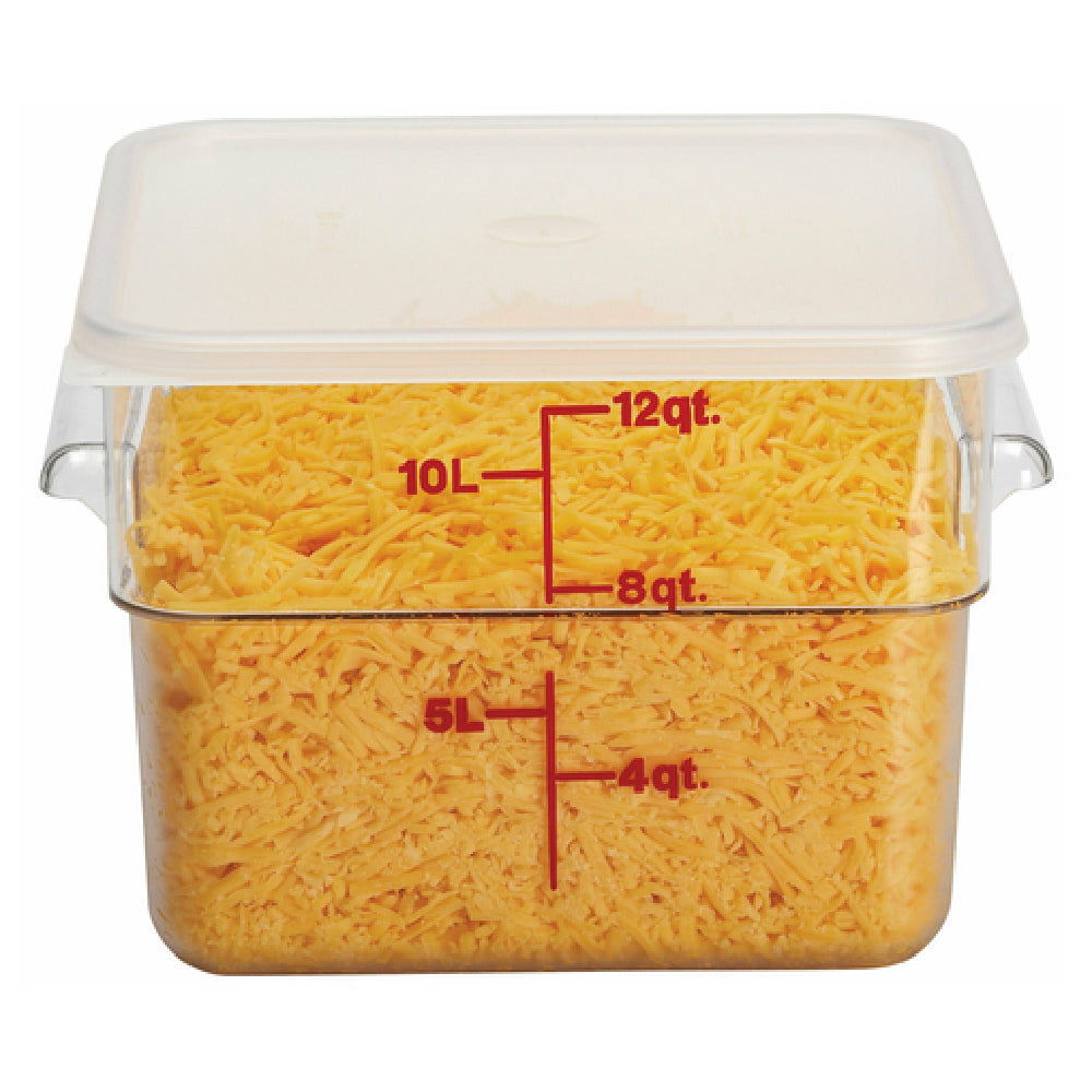 Cambro, 12SFSCW135, CamSquare® Food Container, 12 qt., 11-1/4"L x 12-1/4"W x 8-5/16"H, with handles, red graduation, polycarbonate, dishwasher safe, resists stains & odors, clear, NSF