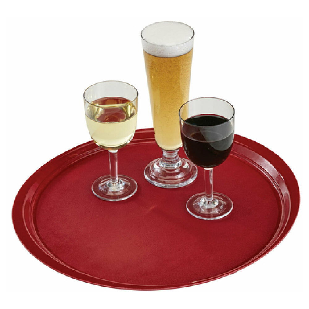 This fiberglass round tray offers a non-skid EpicTread™ surface that provides superior grip during service operations. Its dishwasher-safe construction simplifies cleaning routines, while the dark burgundy wine finish ensures a professional presentation. The tray’s robust material ensures longevity under frequent use, aligning with high-demand foodservice workflows. Its precise 15-7/20 inch diameter fits standard bussing and serving carts, supporting streamlined operations in commercial kitchens and catering venues.