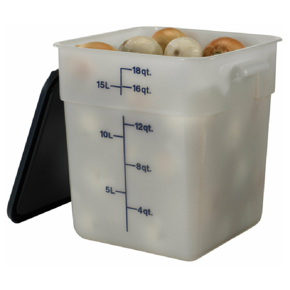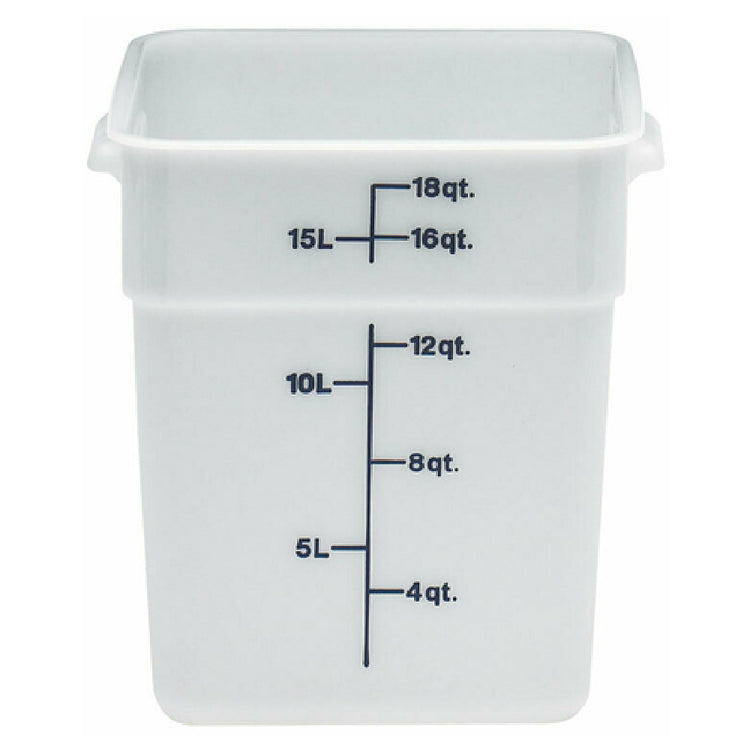 The Cambro 18SFSP148 CamSquare® Food Container is a durable, high-capacity polyethylene storage solution designed for professional foodservice environments. With an 18-quart capacity and precise dimensions of 11-1/4 inches in length, 12-1/4 inches in width, and 12-5/8 inches in height, this container facilitates efficient ingredient organization and bulk storage. Its square shape optimizes refrigeration and shelving space, making it suitable for commercial kitchens requiring reliable, stackable food storage options. The container's dishwasher-safe polyethylene construction resists stains and odors, ensuring sanitation and ease of maintenance during daily operations. Its natural white exterior with blue graduation marks enhances visibility of contents and portion control, aligning with high-volume foodservice workflows.
