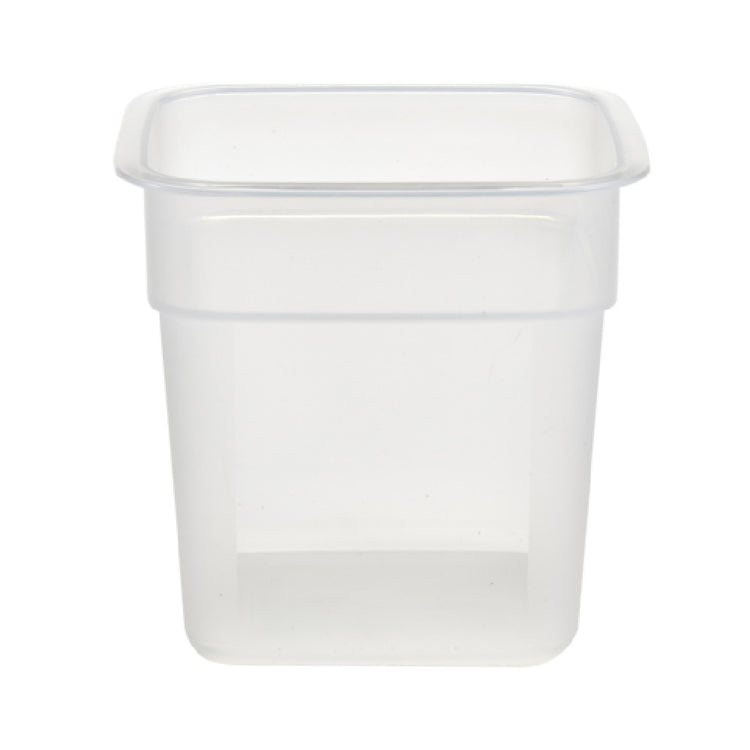 A commercial food storage container is a durable, food-safe vessel designed for storing, portioning, and organizing ingredients in high-volume foodservice operations. The Cambro 1SFSPROPP190 is a square polypropylene container suited for precise portioning and space-efficient stacking within busy kitchens. It is commonly installed in prep stations, refrigerated units, or storage racks, supporting efficient workflow and hygiene standards. This container is ideal for applications requiring frequent cleaning, quick content identification, and long-lasting performance in restaurant or cafeteria settings.