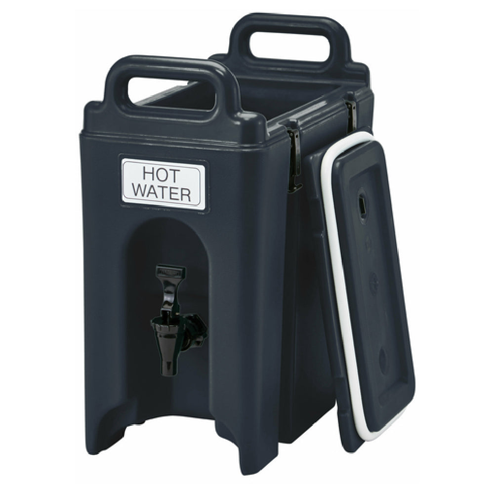 A commercial beverage dispenser is a professional-grade insulated container used for storing, transporting, and dispensing hot or cold beverages in high-volume foodservice settings. The Cambro 250LCD110 model is an insulated beverage carrier constructed from NSF-certified plastic, capable of holding 2-1/2 gallons of liquid. Typically installed in catering, buffet, or hospitality environments, it supports efficient workflow by enabling easy transport and service of beverages, maintaining temperature stability during transit, and ensuring sanitation compliance. This model is best suited for moderate-output applications requiring durability and portability in professional foodservice operations.