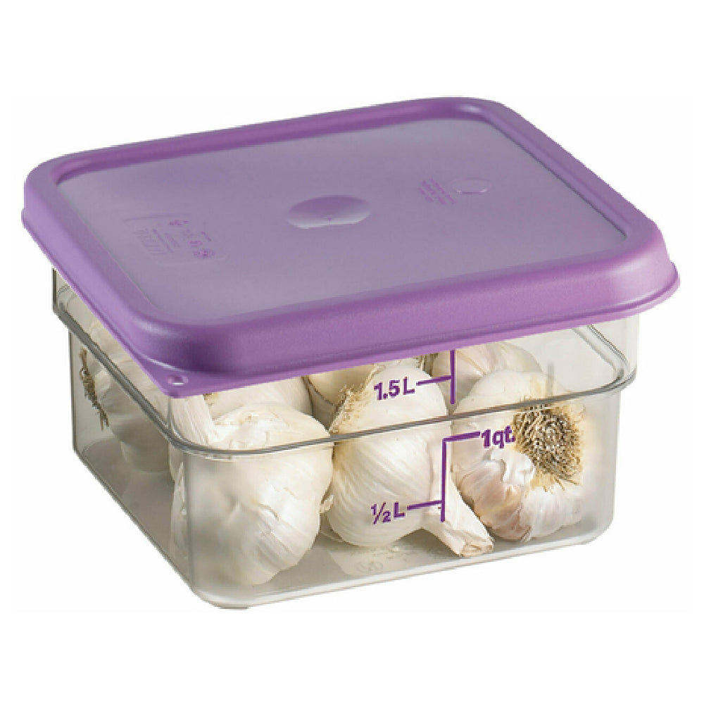 The Cambro 2SFSCW441 features a sturdy polycarbonate construction with a weight of 0.57 lbs, designed for frequent handling and long-term durability. Its dimensions measure 7-1/4 inches in length and width with a height of 3-7/8 inches, providing a 2-quart capacity appropriate for medium-volume storage. The container is dishwasher safe and resistant to stains and odors, ensuring straightforward cleaning and sanitation. It is available in allergen-free purple with an allergen logo imprint, facilitating safe and compliant food handling in commercial operations. The material supports safe maximum operating temperatures, making it suitable for refrigeration environments, while the impact-resistant design withstands daily commercial use.