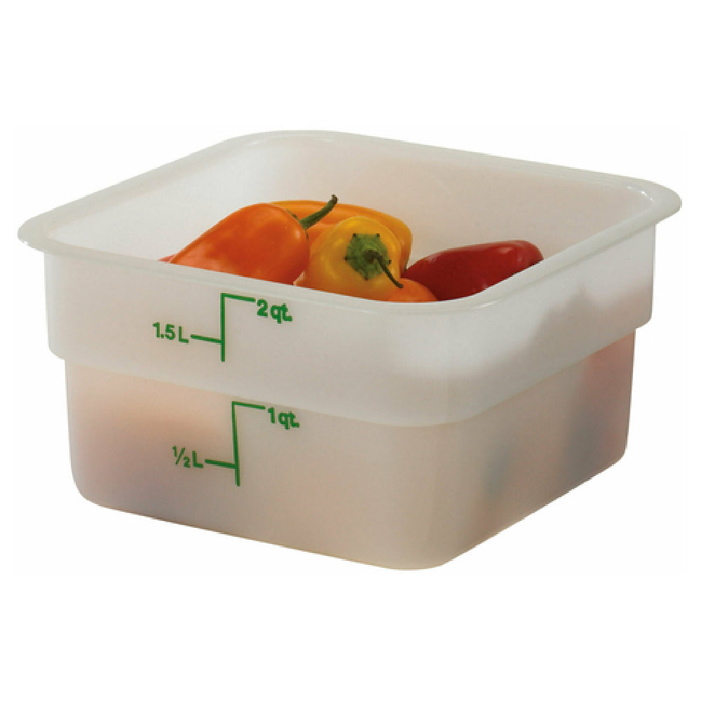 Cambro, 2SFSP148, CamSquare® Food Container, 2 qt., 7-1/4"L x 7-1/4"W x 3-7/8"H, green graduation, polyethylene, dishwasher safe, resists stains & odors, natural white, NSF