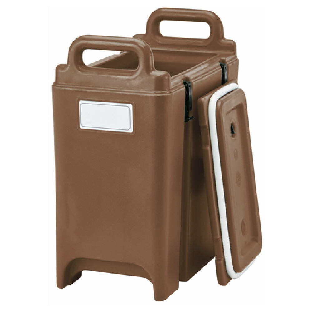 The Cambro 350LCD131 Camtainer® Soup Carrier features a 3-3/8 gallon capacity within a 9" W x 16-1/2" D x 18-3/8" H steel-reinforced insulated plastic body designed for dependable temperature retention. It weighs 12.27 lbs and offers long-term durability combined with ease of cleaning, thanks to its simplified disassembly and maintenance. The dark brown finish provides a professional appearance, while its propylene construction ensures compatibility with a variety of liquids. The carrier's dimensions and weight optimize handling and transport, with a design suitable for demanding foodservice environments.