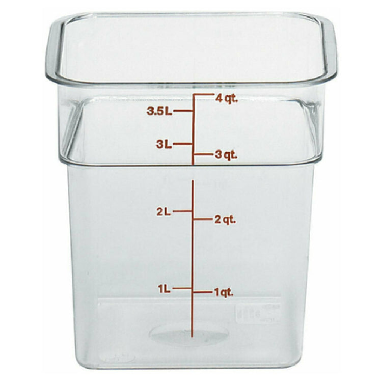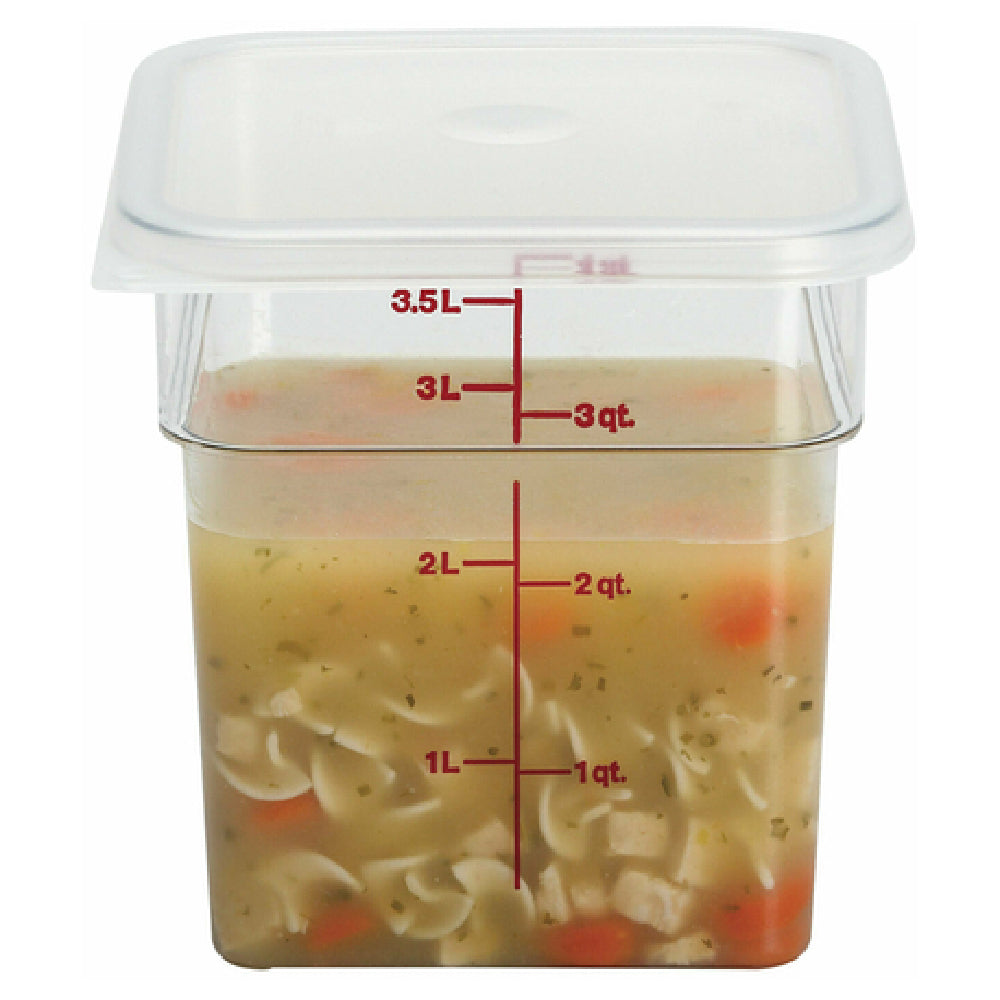 Why choose the Cambro 4SFSCW135 CamSquare® Food Container over other storage solutions? Its impact-resistant polycarbonate construction ensures longevity under demanding kitchen conditions. The precise 4-quart capacity and space-efficient square shape optimize storage density. Its dishwasher-safe design and clear visibility with red graduation aid in sanitation and portioning accuracy, supporting consistent food quality and operational efficiency in commercial kitchens. The robust, stackable profile improves storage management and workflow, making it a practical choice for professional foodservice environments seeking reliable storage equipment.