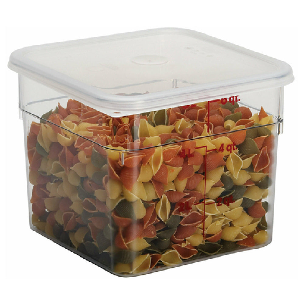 A commercial food storage container is a durable, impact-resistant vessel used in professional kitchens to organize, store, and preserve ingredients. Designed for high-volume use, these containers are typically made from materials like polycarbonate to withstand frequent handling, washing, and stacking. The Cambro 6SFSCW135 CamSquare® Food Container, with its precise 6-quart capacity and clear, stain-resistant polycarbonate body, is ideal for bulk ingredient storage, portion control, and maintaining food safety in busy foodservice operations. Installed in prep stations or storage cabinets, it supports efficient workflow and inventory management in medium-volume restaurants, cafeterias, and catering services.