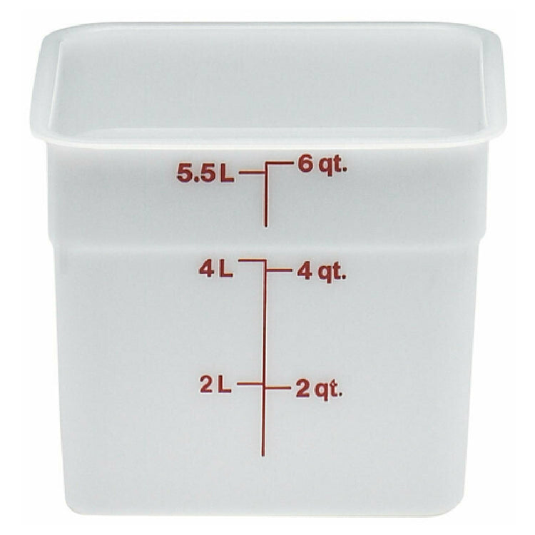 This food storage container offers technical features tailored for commercial kitchens, including precise 6 qt. capacity, polyethylene construction for impact resistance, and dishwasher-safe design for efficient cleaning. Its square shape facilitates optimal stacking and space management in busy prep areas, while the red graduated measurements simplify portioning. Compatible with standard shelving and storage systems, it supports streamlined workflows and sanitation standards in high-demand foodservice settings.