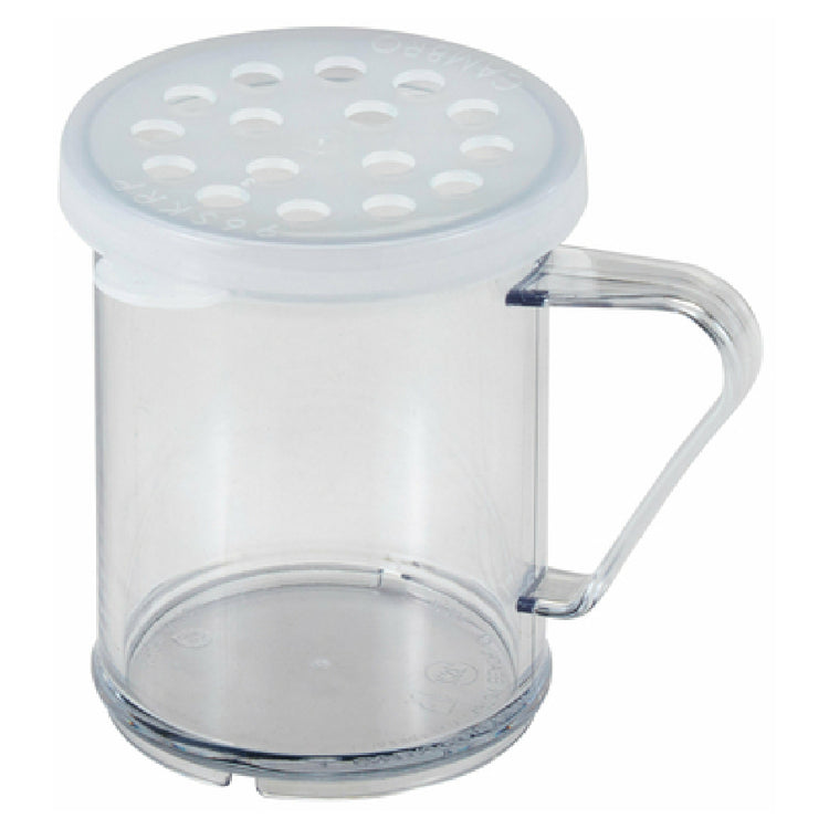 A commercial shaker and dredge is a foodservice tool designed for the precise application of herbs, spices, and seasonings in high-volume environments. These units are typically constructed from durable plastics or metals built to withstand frequent use and cleaning. The Cambro 96SKRP135 Camwear® Shaker/Dredge is a 10 oz. capacity device made from impact-resistant polycarbonate, featuring a perforated lid for portion control and ease of access. Installed in restaurant condiment stations or buffet setups, this shaker supports efficient seasoning distribution, improves workflow, and maintains sanitation standards. Its robust design makes it suitable for fast-paced settings such as cafes, catering, or institutional kitchens, where quick, accurate, and sanitary food presentation is essential.