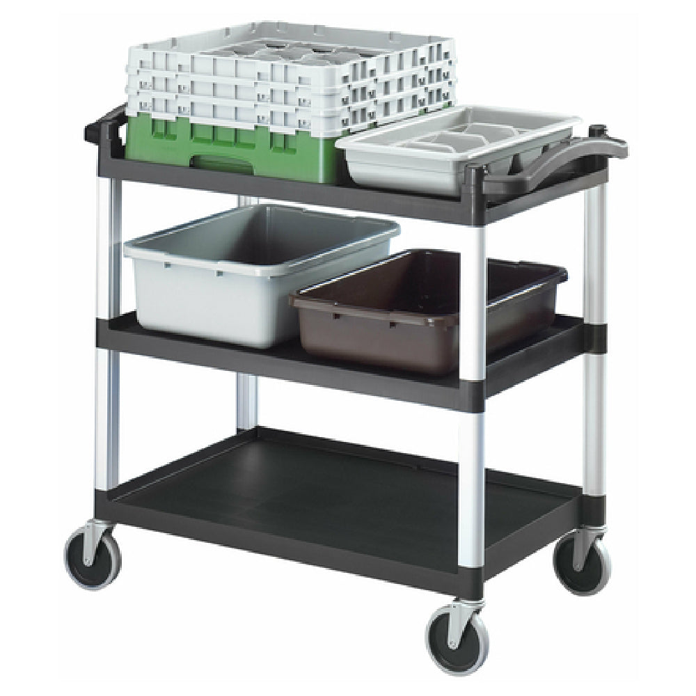 This utility cart is engineered for demanding commercial foodservice workflows, offering (3) spacious shelves with a 20-1/2" x 31-1/2" surface area. The polyethylene construction ensures long-term durability; equipped with 5" swivel casters (no brakes) for versatile maneuvering. The open design facilitates quick access and cleaning, suitable for transport and storage in busy kitchens or catering operations. Its high load capacity allows for versatile stacking and movement of kitchen supplies, making it an integral component of workflow efficiency in high-volume settings.