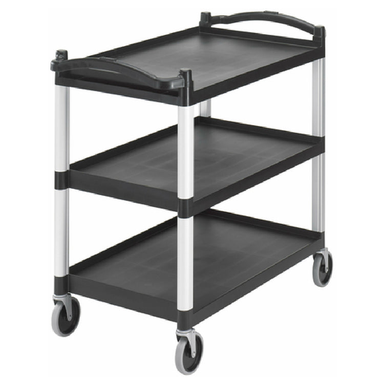 The Cambro BC340KD110 Utility Cart features a durable open design with (3) polyethylene shelves, optimized for high-traffic foodservice environments. Designed with ease of mobility and load capacity in mind, this commercial-grade utility cart supports up to 400 pounds and measures approximately 20-1/2" x 31-1/2" per shelf. Its black polyethylene exterior provides corrosion resistance and straightforward cleaning, making it ideal for custodian, catering, and operations staff managing supply transports, dishware, or ingredients in busy kitchens.