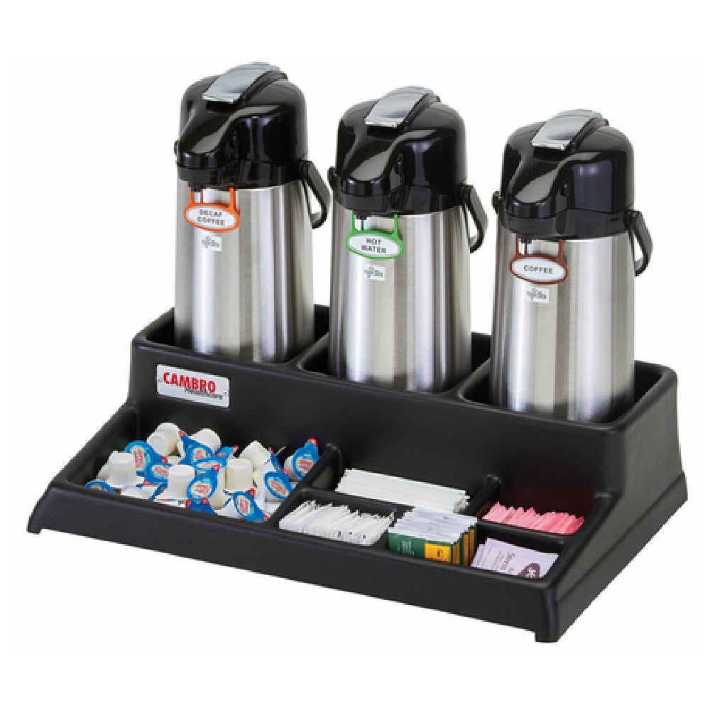 The Cambro BSACS110 Airpot Station is a commercial-grade serving solution designed for hospitality and foodservice environments. Measuring 23-1/4 inches in width, 15-3/8 inches in depth, and 6 inches in height, it provides a stable platform capable of holding three airpots simultaneously. Crafted from durable ABS plastic in a sleek black finish, this airpot station features an integrated front condiment organizer, enhancing workflow efficiency and guest service presentation. It offers a practical, space-efficient option for catering, conference facilities, and cafeteria setups, supporting quick and organized beverage service with precise technical specifications for high-volume foodservice operations.