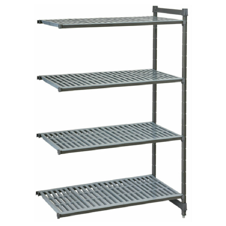 The Cambro CBA216072V4580 Camshelving® Basics Plus Add-On Unit is a durable, modular storage solution designed for high-efficiency foodservice environments. As an all-plastic shelving unit, it features four vented polypropylene shelves with Camguard® antimicrobial protection, providing resistance against microbial growth. Constructed with brushed graphite finish, this 21" wide x 60" long x 72" high add-on system supports a maximum capacity of 1,800 lbs, with each shelf rated for 600 lbs (400 lbs for the top shelf). Engineered for temperature resilience from -36°F to 190°F, it’s suitable for cold storage, hot hold areas, and versatile commercial kitchen workflows. Its pre-assembled composite posts with leveling feet facilitate quick setup, making it an optimal choice for organized, sanitation-conscious foodservice storage or prep areas requiring scalable shelving expansion.
