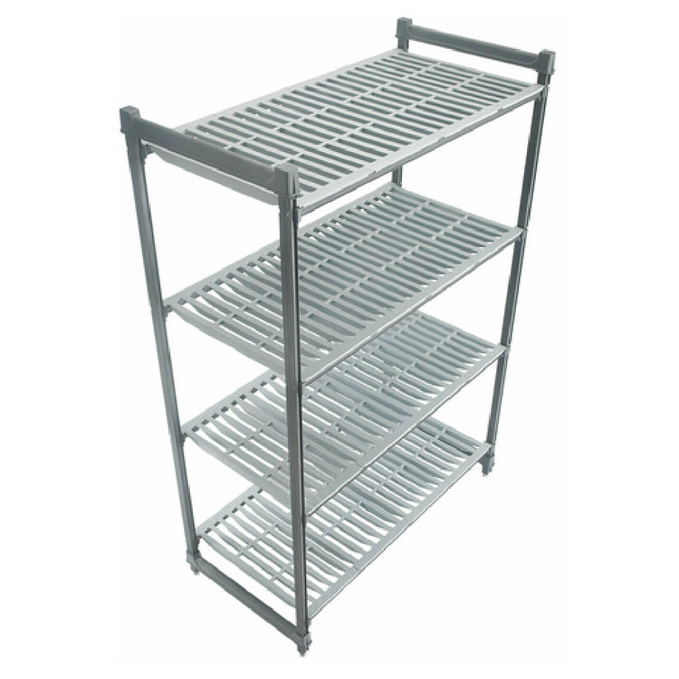 This Cambro shelving starter unit offers high-density storage for foodservice facilities, combining strength, antimicrobial protection, and ease of maintenance. Its four vented polypropylene shelves support heavy loads, while composite posts with leveling feet ensure stability on uneven floors. The unit’s corrosion-resistant finish and antimicrobial shelf plates improve sanitation, making it ideal for applications like prep stations or warehouse storage. The pre-assembled design facilitates quick deployment, enhancing workflow efficiency for medium-volume foodservice operations.