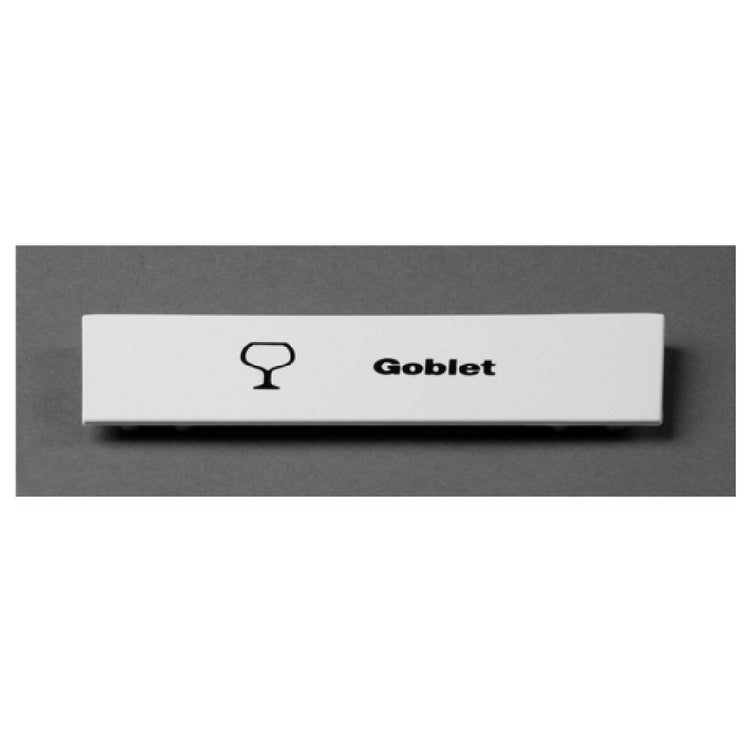The Camrack® extender ID clip model CECGO6000 is constructed from high-quality ABS with dimensions of 5 inches in width and 1-9/16 inches in height, and it weighs approximately 0.04 lbs. Designed for durability in demanding commercial environments, it features a snap-on mounting mechanism compatible with all Camrack® units. Its white finish ensures visibility against various warewashing backgrounds, and the pre-printed "Goblet" graphic supports accurate identification of glassware racks. The clip is resistant to typical cleaning chemicals, making it suitable for frequent sanitation processes. Installation requires minimal clearance, and it maintains a secure fit even during heavy dishwashing cycles, contributing to overall operational efficiency.